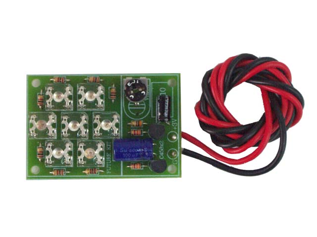 Kit comes with complete with a circuit discription, circuit board, components, 7 Super Bright LEDs and step by step instructions. Requires basic soldering skills, a small amount of solder and a 15 to 30 watt soldering iron. Requires 3 volts DC to operate.